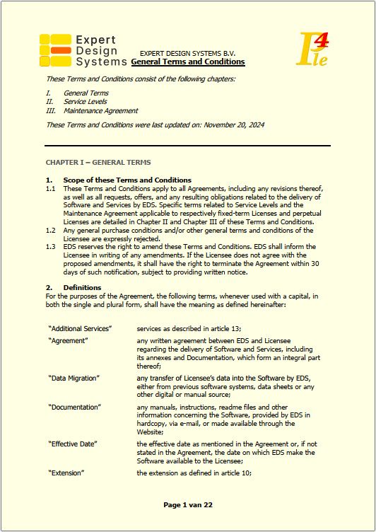 The general terms and conditions (GTC's) of EDS are applicable to both the (use of the) PLE software and the services that Expert Design Systems does deliver.
